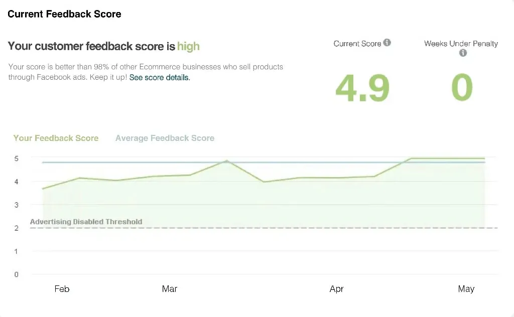 Our Facebook Official Customer Feedback Score Has Reached 4.9 out of 5. The score is better than 98% of other Ecommerce businesses who sell products through Facebook ads